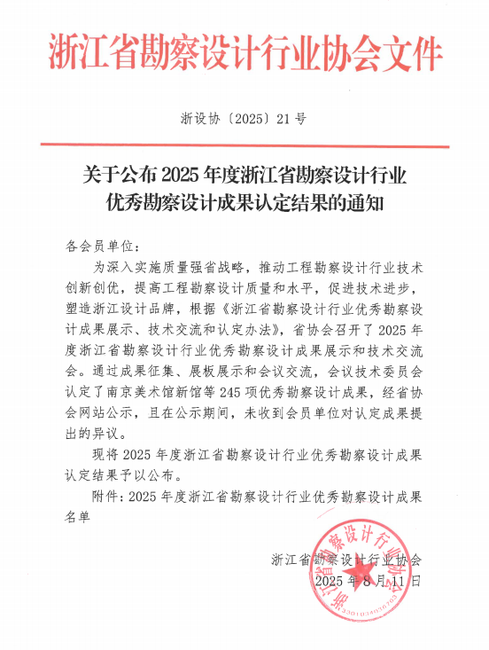 發(fā)布日期:2025.08.26 近日,2025年度浙江省勘察設(shè)計(jì)行業(yè)優(yōu)秀勘察設(shè)計(jì)成果評(píng)選結(jié)果正式公布。由我院牽頭設(shè)計(jì)的“奉化江堤防整治工程鄞奉交界段”項(xiàng)目,繼榮獲寧波市優(yōu)秀勘察設(shè)計(jì)獎(jiǎng)之... -