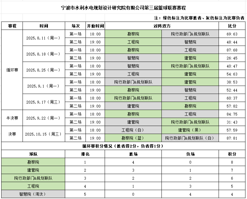 八月盛夏,激情點燃。寧波市水利院第三屆"智慧杯"職工籃球聯(lián)賽在集士港體育公園籃球場火熱開幕!這不僅是一場競技的較量,更是一次寧波院人團(tuán)結(jié)拼搏、斗志昂揚(yáng)的集中展現(xiàn)。經(jīng)過兩個月的鏖戰(zhàn),最終勘察院隊強(qiáng)勢問鼎冠軍,建管院隊與院行政部門&規(guī)劃聯(lián)隊分別獲得亞軍、季軍。現(xiàn)在,就讓我們一同回顧這段充滿汗水與激情的籃球時光!