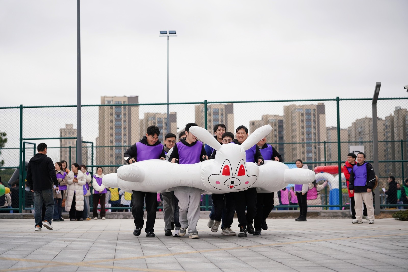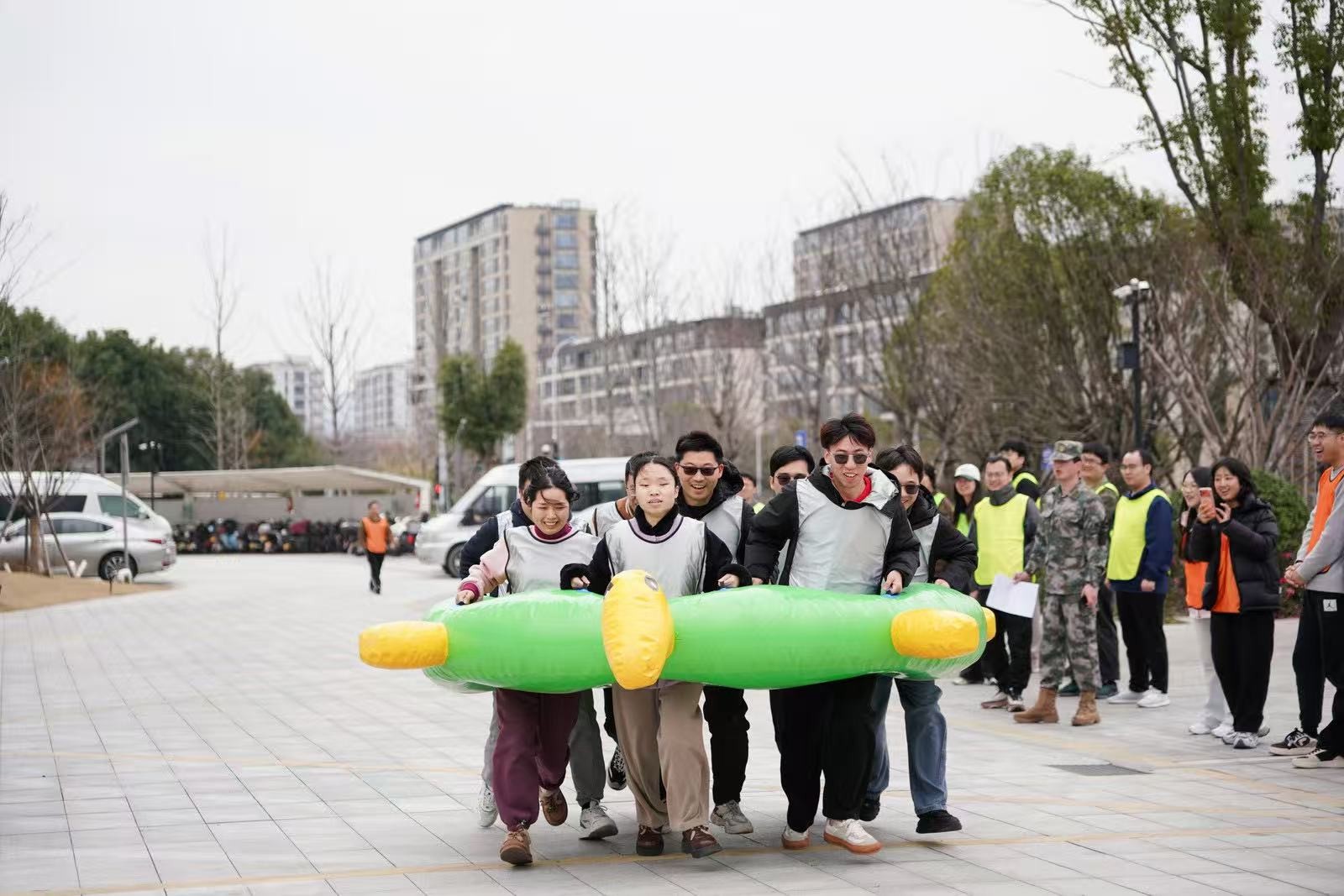 在“南水北調(diào)”項目中,隊員們手持PVC管接力運水,5分鐘內(nèi)爭分奪秒,讓水流在管中傳遞涌向重點,仿佛將團隊的信任與責任匯聚成河。“龜兔賽跑”則讓隊員們化身可愛的“烏龜”和“兔子”,在賽道上你追我趕,妙趣橫生。“鴻運亨通”需要8人共同托舉大球折返跑,大家步調(diào)一致,齊頭并進。“一錘定音”環(huán)節(jié),隊員們揮動充氣大錘敲破氣球,每一聲“砰”響都引來陣陣喝彩。