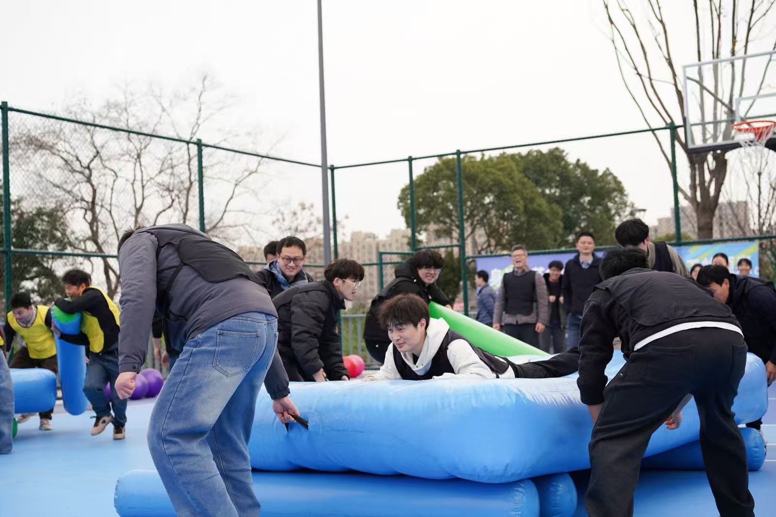“勇立潮頭”考驗的是反應與穩(wěn)定,隊員們圍成圓圈快速移動,同步接住充氣柱,1分鐘內(nèi)有效移動次數(shù)不斷刷新。“超級NBA”中,大家用瑜伽球投籃,雖姿勢各異,但進球瞬間的歡呼同樣熱烈。“乘風破浪”要求隊員在充氣墊上接力鋪設(shè)充氣棒,讓體重不輕于75kg的“重量級”選手穩(wěn)坐墊上,隊友們默契配合,如乘風破浪般前行。最后的“巨人腳步”由每隊兩名領(lǐng)隊腳穿巨型鞋蹼接力奔跑,滑稽的動作引來全場笑聲不斷。