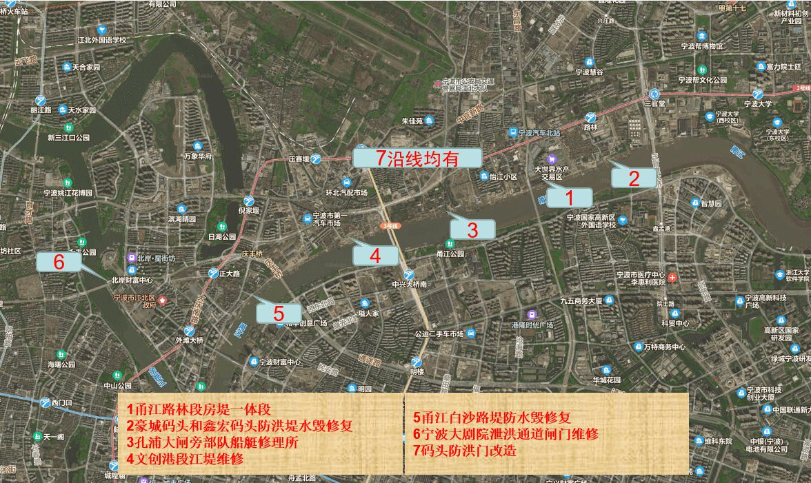 本工程建設內容包括甬江路林段房堤一體段、豪城碼頭和鑫宏碼頭防洪堤水毀修復;孔浦大閘旁部隊船艇修理所、文創(chuàng)港段江堤維修;甬江白沙路堤防水毀修復;寧波大劇院泄洪通道閘門維修;碼頭防洪門改造等水毀修復水利工作。