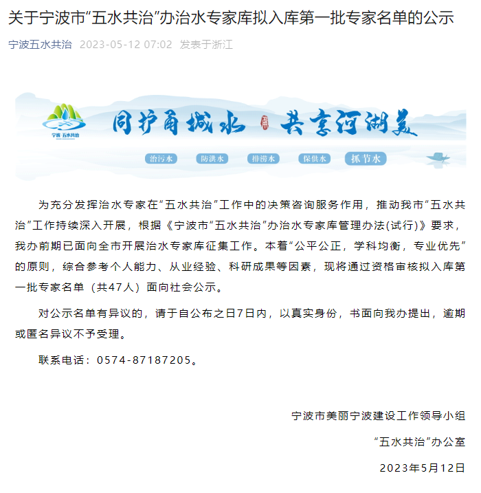 為充分發(fā)揮治水專家在“五水共治”工作中的決策咨詢服務作用,推動我市“五水共治”工作持續(xù)深入開展,根據(jù)《寧波市“五水共治”辦治水專家?guī)旃芾磙k法(試行)》要求,寧波市美麗寧波建設工作領導小組“五水共治”辦公室前期已面向全市開展治水專家?guī)煺骷ぷ鳌?/span>