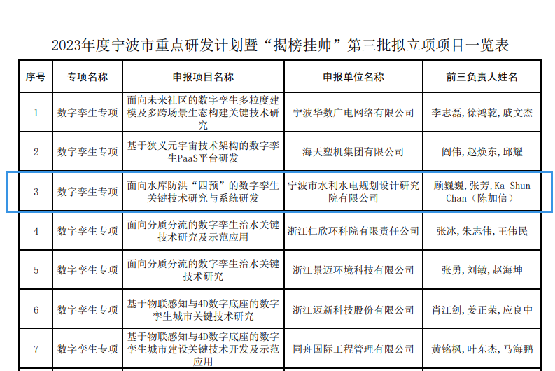 近日,2023年度寧波市重點研發(fā)計劃暨“揭榜掛帥”第三批擬立項項目公示,我院“面向水庫防洪‘四預’的數字孿生關鍵技術研究與系統(tǒng)研發(fā)”項目成功上榜。